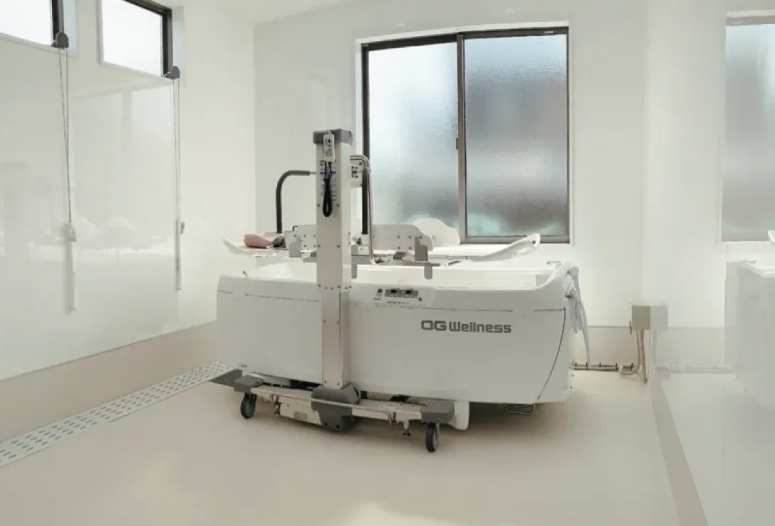 寝たままでも安心・安全に介助入浴ができる機械浴設備。座位姿勢ができても立ち位が困難なや、寝たきりの方、大柄な方でもゆったりと入浴できます。